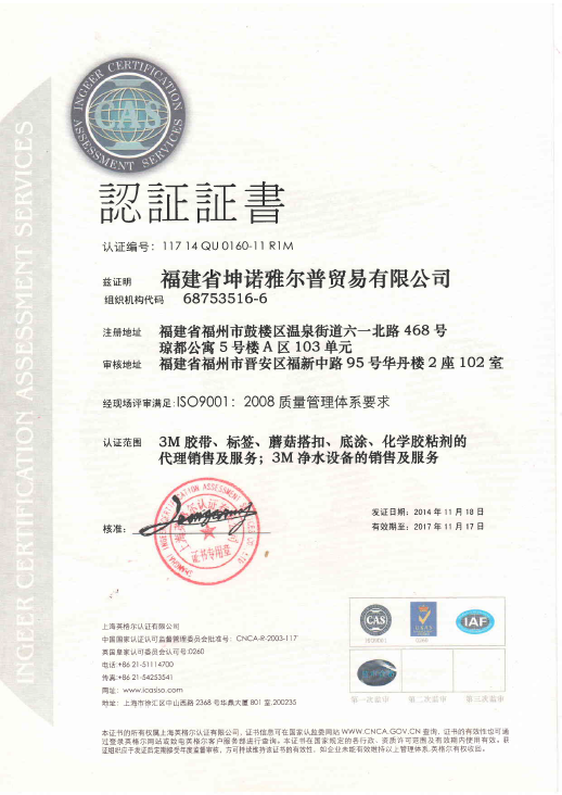 福建省坤诺雅尔普贸易有限公司成立于2011年8月,为3M中国有限公司的特约经销商。公司主要经营的产品有: 3M工业胶带、汽车胶带、BOSTIK工业粘合剂、3M建筑隔热防爆贴膜、3M净水器、3M空气净化器、3M优视灯等系列产品。目前主要客户广州福耀、申雅密封件等,均为相应行业的标竿企业,具有良好的发展前景和较高的资信情况。公司秉承3M公司“以卓越的品质、价值和服务满足客户要求”的企业经营理念,同时把“诚实守信”作为每个员工的办事宗旨,“让客户放心”成了我们处理每一项业务的原则。